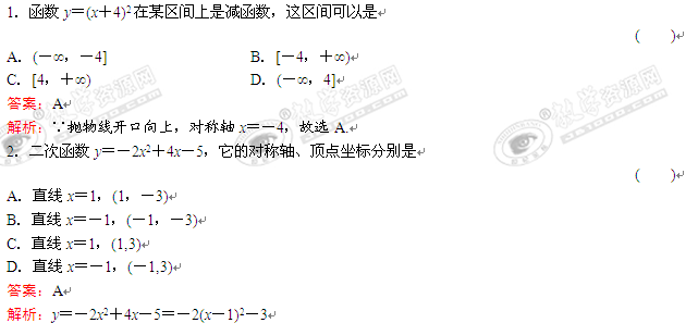 数学:2.2.2《二次函数的性质与图象》同步练习(人教B版必修1)