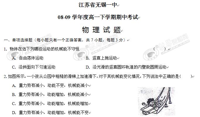 江苏省无锡一中08-09学年高一下学期期中考试(物理)