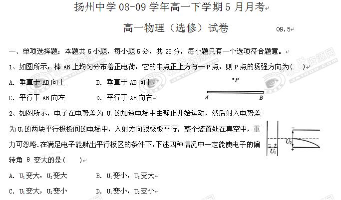 江苏省扬州中学08-09学年高一下学期5月月考(物理)选修卷