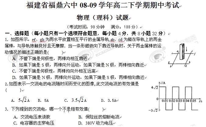 福建省福鼎六中08-09学年高二下学期期中考试(物理理)