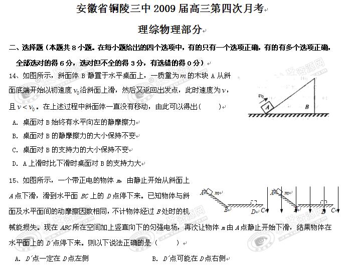 安徽省铜陵三中2009届高三第四次月考(理综物理部分)