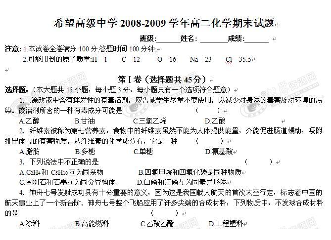 陕西省渭南市希望中学08-09学年高二下学期期末考试(化学)