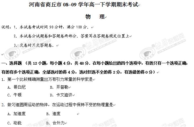 河南省商丘市08–09学年高一下学期期末考试(物理)