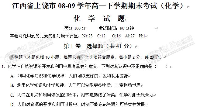 江西省上饶市08-09学年高一下学期期末考试(化学)