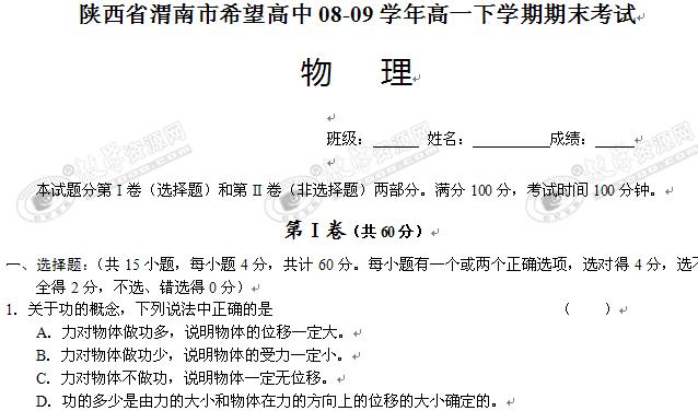 陕西省渭南市希望高中08-09学年高一下学期期末考试(物理)