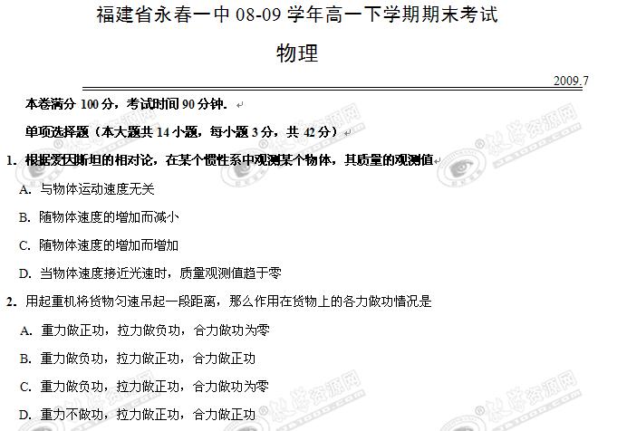 福建省永春一中08-09学年高一下学期期末考试(物理)