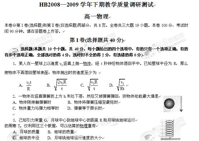 河南省鹤壁高中08-09学年高一下学期期末质检(物理)