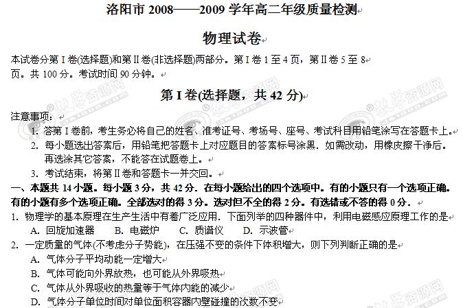 河南省洛阳市08-09学年高二下学期期末考试(物理)