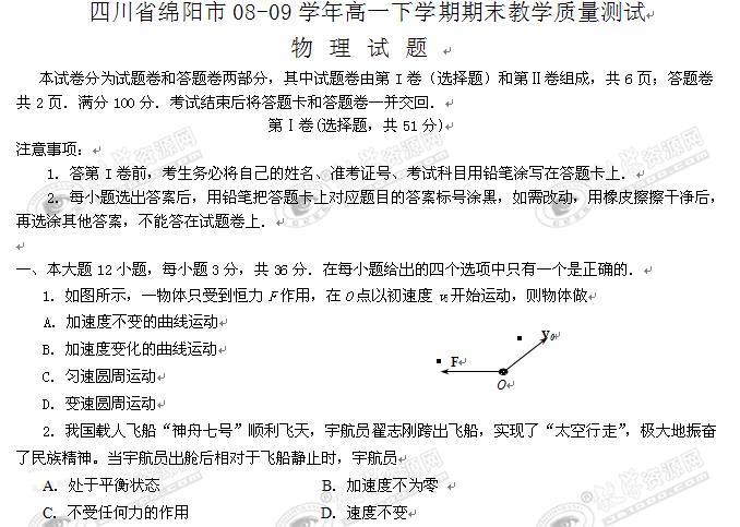 四川省绵阳市08-09学年高一下学期期末教学质量测试(物理)
