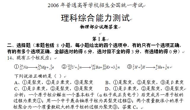 甘肃省2006年全国高考理综Ⅱ(物理部分逐题解析)