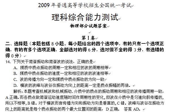 甘肃省2009年高考全国卷II理综(物理部分逐题解析)