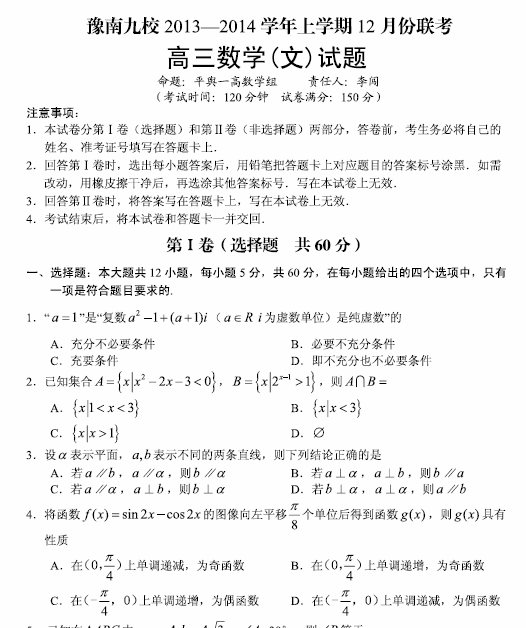 河南省豫南九校2014届高三上学期12月联考(数学文)扫描版