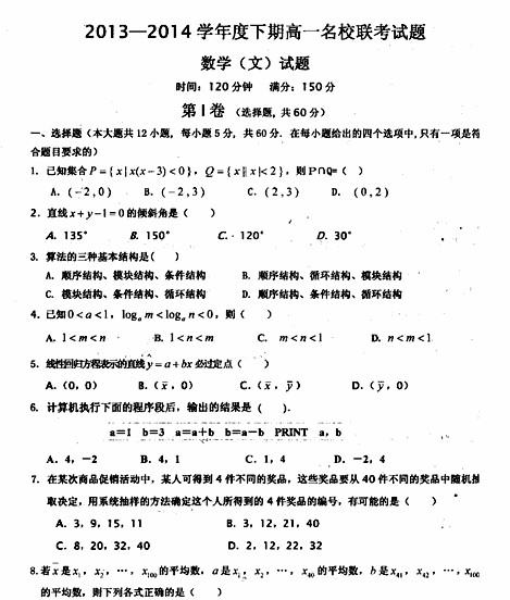 河南省周口市名校2013-2014学年高一3月联考(数学文)扫描版缺答案