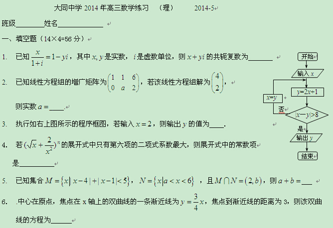 上海市大同中学2014届高三下学期5月(三模)考试(数学理)