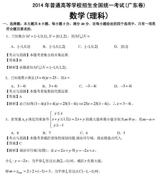 2014年普通高等学校招生全国统一考试广东卷(数学理)扫描解析版