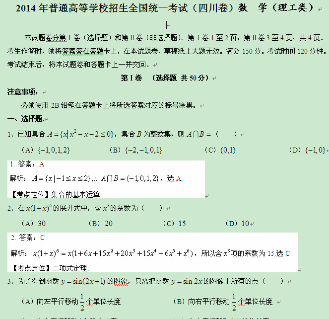2014年普通高等学校招生全国统一考试四川卷(数学理)小题解析