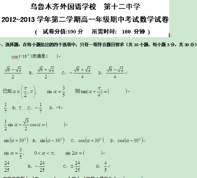 新疆乌鲁木齐市第十二中学2012-2013学年高一下学期期中考试(数学)