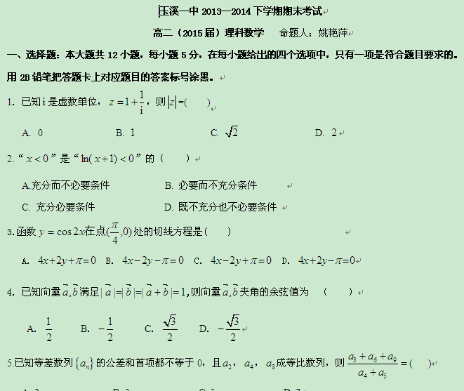 云南省玉溪一中2013-2014学年高二下学期期末考试(数学理)