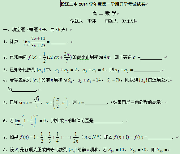 上海市松江二中2014-2015学年高二上学期开学考试(数学)缺答案
