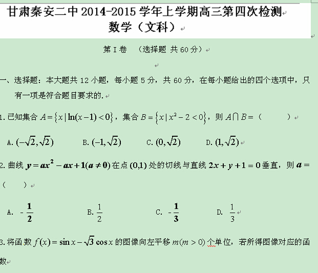 甘肃省天水市秦安县第二中学2015届高三上学期第四次检测(数学文)