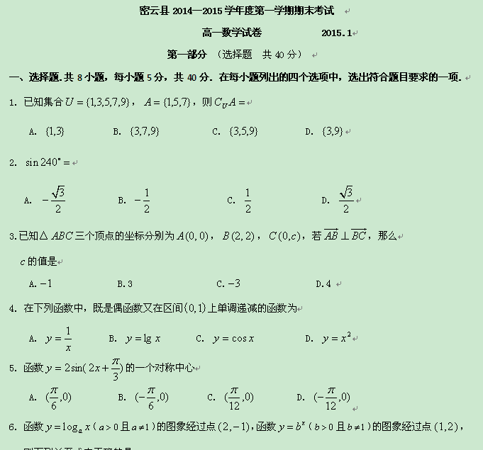 北京市密云县2014-2015学年高一上学期期末测试(数学)