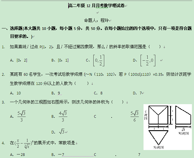湖北省襄阳市第五中学2014-2015学年高二 (12月)月考(数学理)