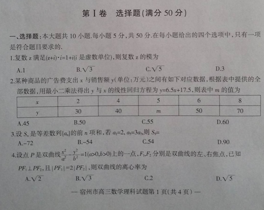 安徽省宿州市2015届高三第一次教学质量检测(数学理)扫描版