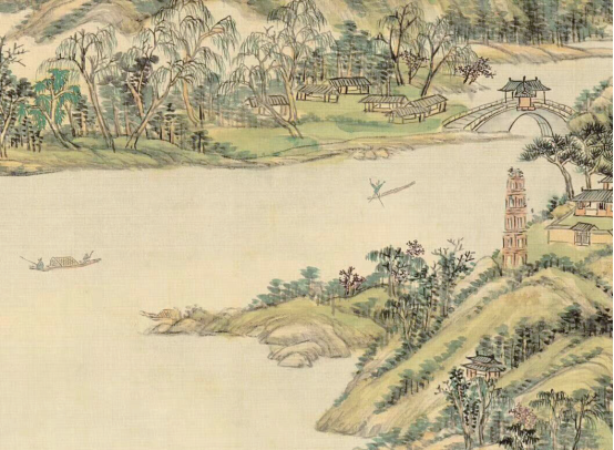 白堤宽阔而敞亮,靠湖边密植垂柳,外层是各色的桃花,回望群山含翠,湖水涂碧,如在画中游。白堤的风景,四季分明:春桃夏柳,秋桂冬雪,风采独特。