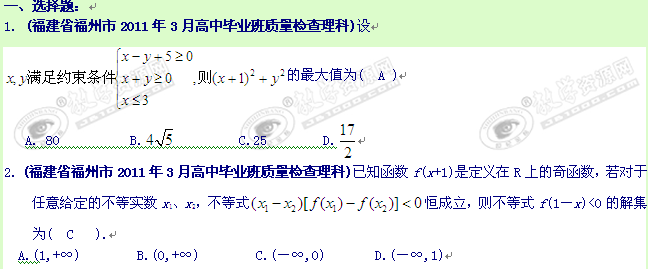福建省各地市2011年高考最新联考数学试题分类汇编(6)不等式