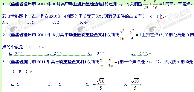 福建省各地市2011年高考最新联考数学试题分类汇编(10)圆锥曲线