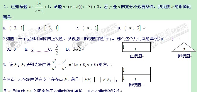 江西省上饶县中学2012届高三上学期第17周(数学)答案不全