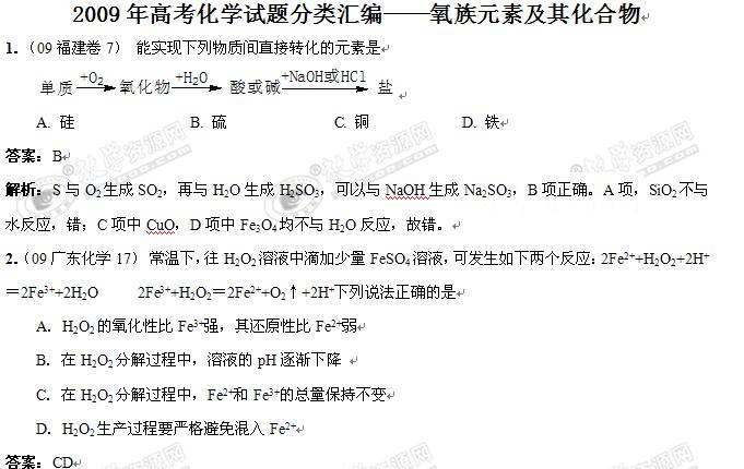 2009年全国高考化学试题分类汇编——氧族元素及其化合物