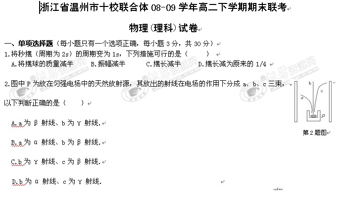 浙江省温州市十校联合体08-09学年高二下学期期末联考(物理)