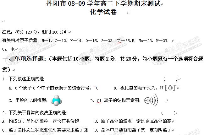 江苏省丹阳市08-09学年高二下学期期末测试(化学)