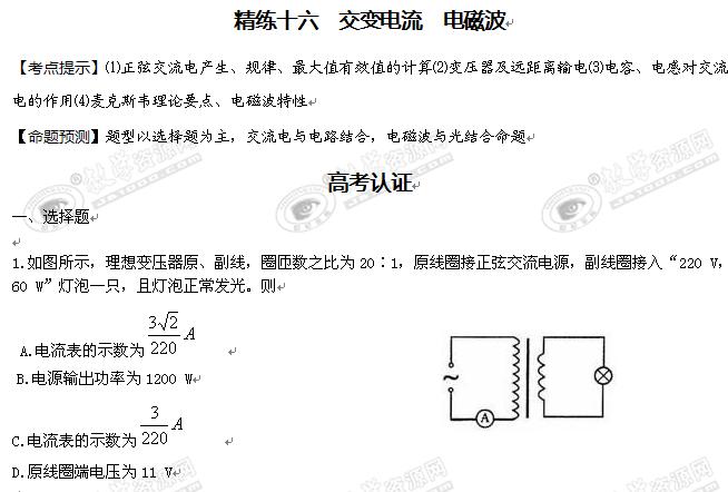 物理:2010届高考物理一轮复习精练十六---交变电流 电磁波