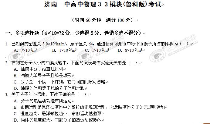 山东省济南一中高中物理3-3模块(鲁科版)考试