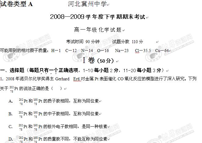 河北省冀州中学08-09学年高一下学期期末考试A(化学)