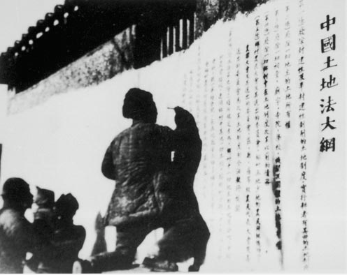 高中历史图片素材:解放区工作人员把《中国土地法大纲》抄写在墙上,进行宣传