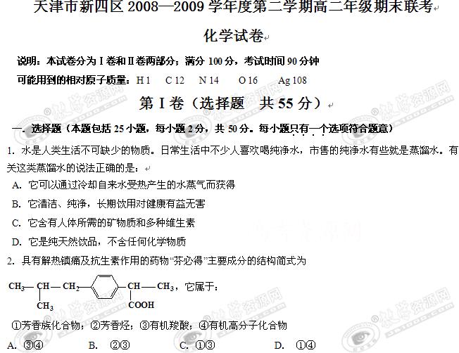 天津市新四区08-09学年高二下学期期末联考(化学)