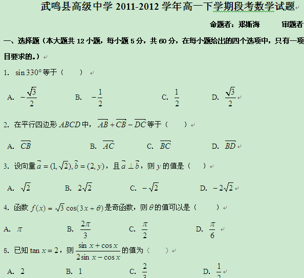 广西武鸣县高级中学11-12学年高一下学期段考(数学)