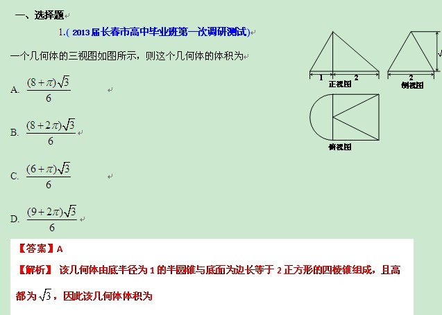 2013年高考数学备考30分钟课堂集训专题系列专题06 立体几何 理(A卷)(教师版) Word版含答案