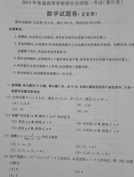 2013年普通高等学校招生全国统一考试(重庆卷)数学文扫描版含答案