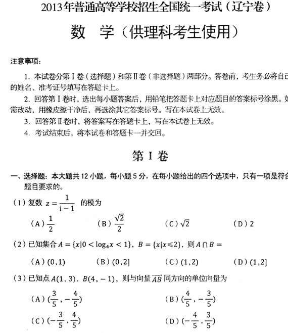 2013年普通高等学校招生全国统一考试辽宁卷(数学理)扫描版含答案