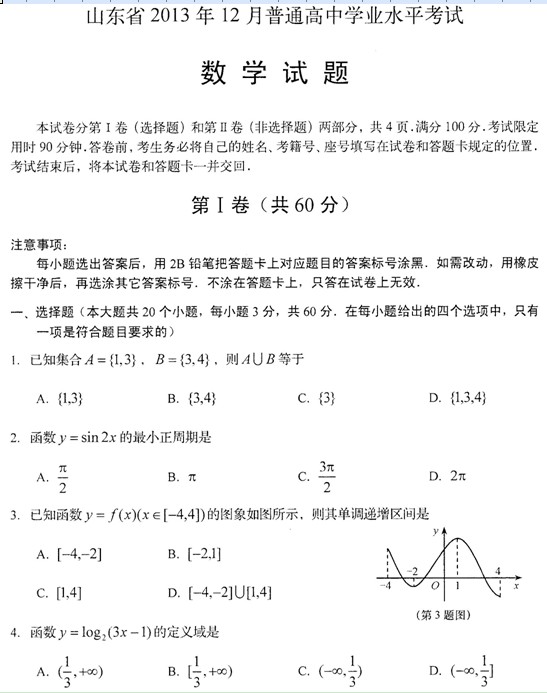山东省2013年12月普通高中学业水平考试(数学)扫描版