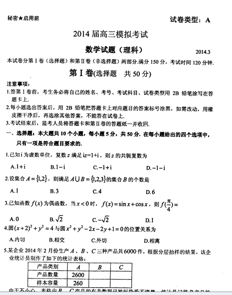 【2014枣庄市一模】山东省枣庄市2014届高三3月模拟考试(数学理)扫描版