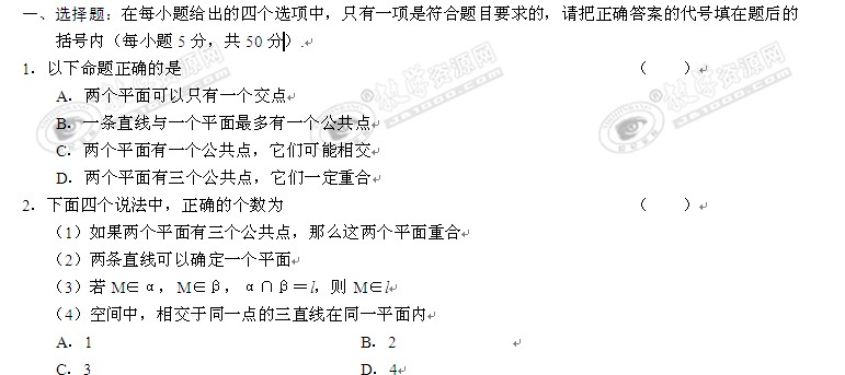 高一数学同步测试:1.2《点、线、面之间的位置关系》(新课标人教B必修2)
