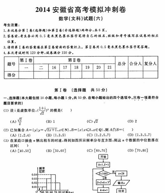 安徽省考试研究中心2014届高考模拟冲刺(六) (数学文) 扫描版
