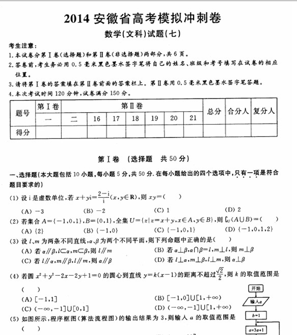 安徽省考试研究中心2014届高考模拟冲刺(七) (数学文) 扫描版
