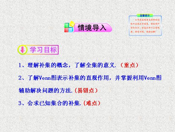 2013版高中同步数学多媒体课件:1.2 第2课时 补集、全集(苏教版必修1)