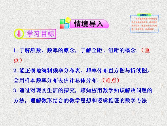 2013版高中数学全程学习夺冠方略多媒体课件:2.2.1 频率分布表 2.2.2 频率分布直方图与折线图(苏教版必修3)